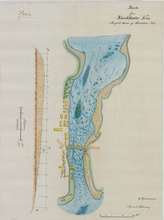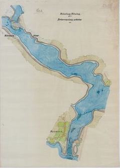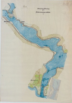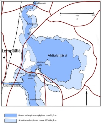 ![]() Kuva. Kuokkalankoskien perkausten vaikutus Vanajaveden pinnan korkeuteen Lempäälässä. V. 1750 vedenpinta-arvio (84,2 m) perustuu peruskartan korkeuskäyriin ja Metsäkeskuksessa tehtyyn analyysiin sekä Pekka Kansasen ja Hannu Tapolan arviointiin. Vedenpinnan nykyinen taso 79,6 m. Kartan piirsi Pekka Kansanen. |
